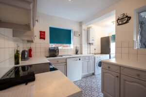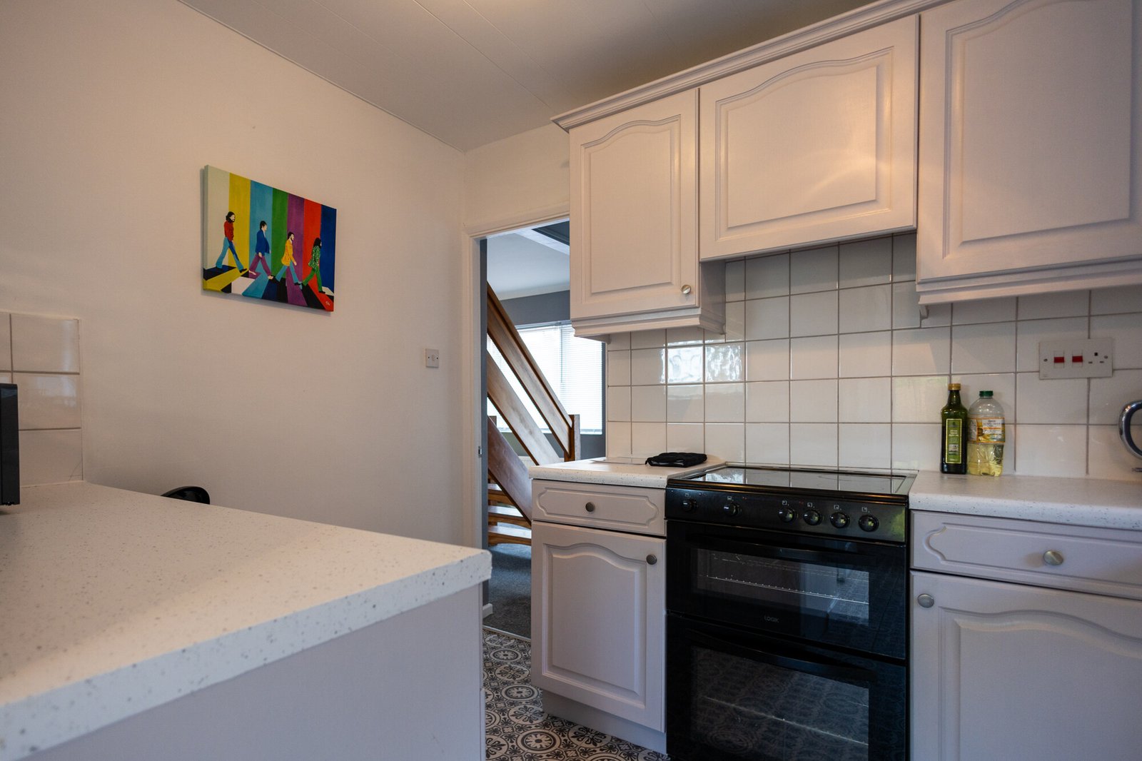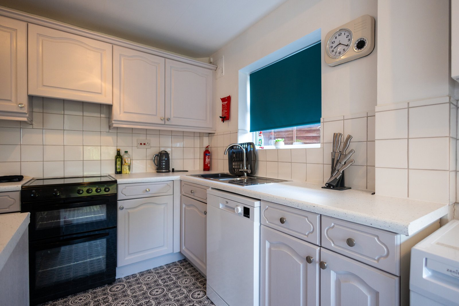 Inside, guests will find spacious contemporary interiors with a warm, homely feel. The three bedrooms with a total of four single beds provide flexible sleeping arrangements, while the fully equipped kitchen includes everything needed for convenient home‑style cooking.